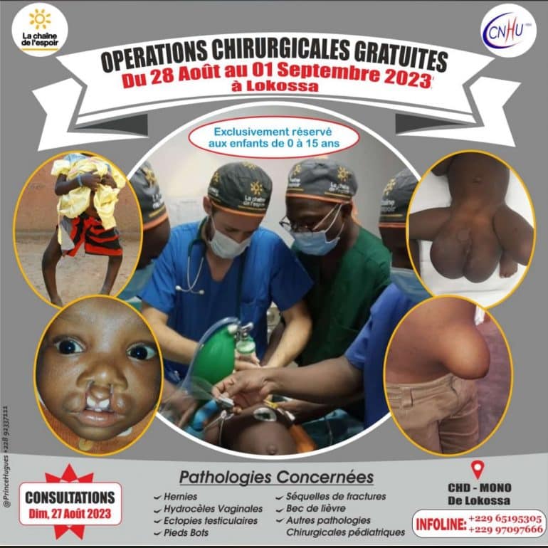 Une campagne d’opérations chirurgicales gratuites se déroule du 28 Août au 01 Septembre 2023 au Centre Hospitalier Départemental CHD Mono de Lokossa. Cette mission exclusivement réservée aux enfants de 0 à 15 ans, prend en charge les pathologies suivantes : Hernies, Hydrocèles Vaginales, Bec de lièvre, séquelles de fractures, ectopies testiculaires et autres pathologies chirurgicales pédiatriques. En prélude à cette campagne, les consultations des patients seront faites le 27 Août 2023 au CHD Mono de Lokossa.