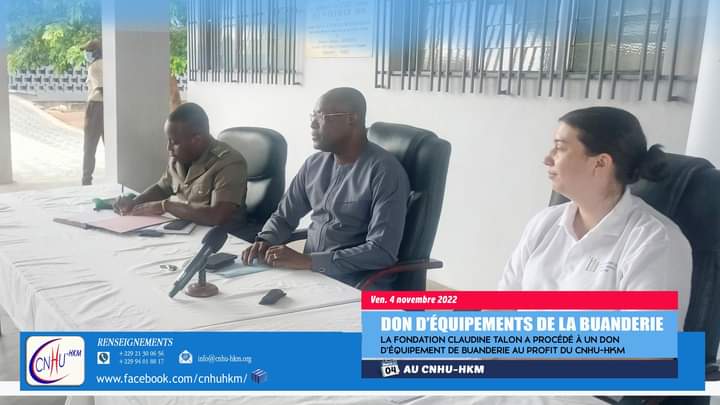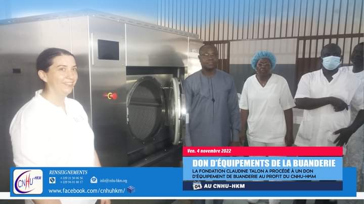 Ce vendredi 04 novembre 2022, la Fondation Claudine Talon a fait don d’équipements pour la buanderie du Centre National Hospitalier Universitaire Hubert K. MAGA. Le don est composé d’une machine à laver et d’un sèche-linge industriel de capacités respectives de 62 kg et 60 kg, ainsi que d’un régulateur de 150 KVA. Selon le Professeur Cyriaque DEGBEY, Chef de la Clinique Universitaire d’Hygiène Hospitalière, de CNHU-HKM ce lot de matériels vient à point nommé.