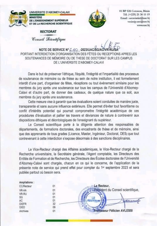 Voici, le colis des membres du jury au cours des soutenances ne sera plus d’actualité à partir du 1er septembre prochain à l’université d’Abomey-Calavi et sur tous ses campus étendue sur le territoire national. Plus de cadeaux aux membres de jury ou de fête organisée à leur plaisir au terme d’une soutenance de mémoire ou de thèse. Le rectorat veut garantir « l’équité, l’éthique, l’intégrité et l’impartialité des processus de soutenance de mémoire ou de thèse.