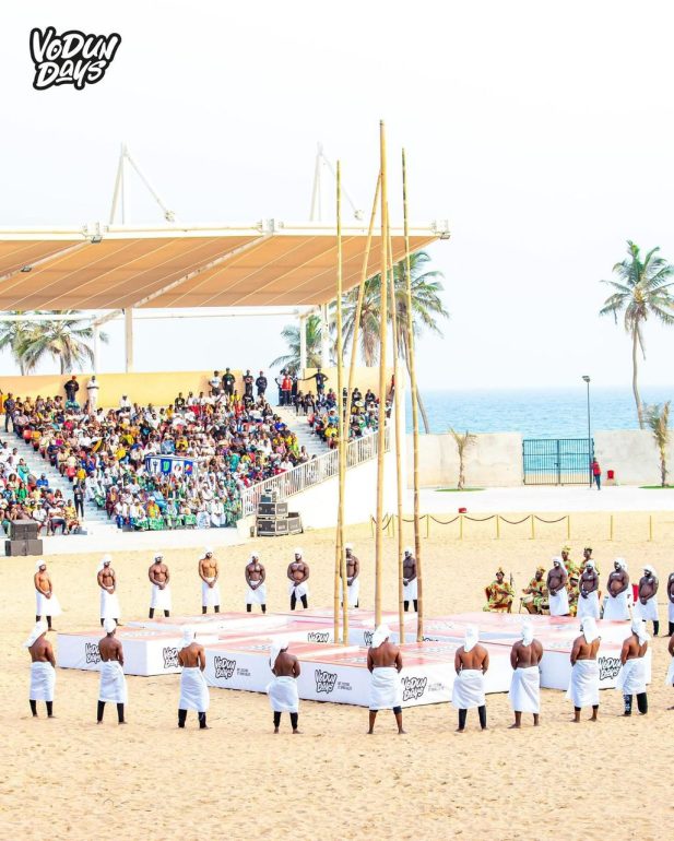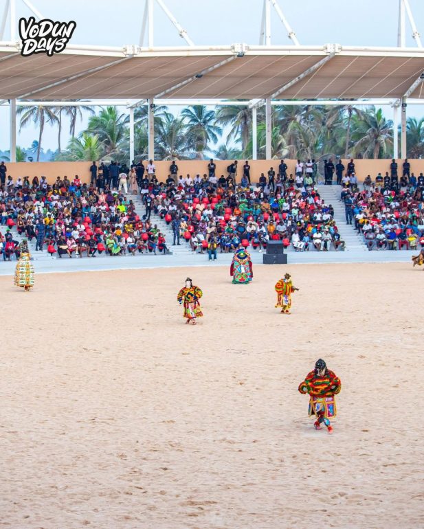 Le troisième jour a été marqué par un moment historique : l’inauguration de l’Arène de Ouidah, près de la Porte du Non-Retour, en présence du président Talon, des masques Egungun et du groupe DaweƟn. Cette structure architecturale allie modernité et symboles traditionnels, et servira à accueillir des spectacles, festivals et cérémonies.