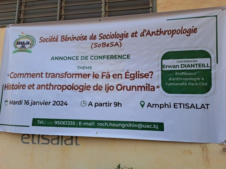 Les discussions sur le Fâ continuent de s’alimenter au lendemain du Toffa 2024. Une conférence sur le thème « comment transformer le Fâ en Église ? histoire et anthropologie de Ijo Orunmila» s’est tenue le Mardi 16 janvier 2024 dans l’amphithéâtre Etisalat de l’Université d’Abomey-Calavi (UAC). C’est une initiative à mettre à l’actif de la Société Béninoise de Sociologie et d’Anthropologie (SoBeSA). La conférence a été animée par Erwan Dianteill, professeur d’anthropologie à l’université Paris Cité et chercheur au Centre d’anthropologie culturelle (CANTHEL). Il a fait des recherches sur le Fâ depuis des décennies. Le conférencier professeur Erwan Dianteill nous dit ce qu’on peut retenir sur la thématique de cette conférence.
