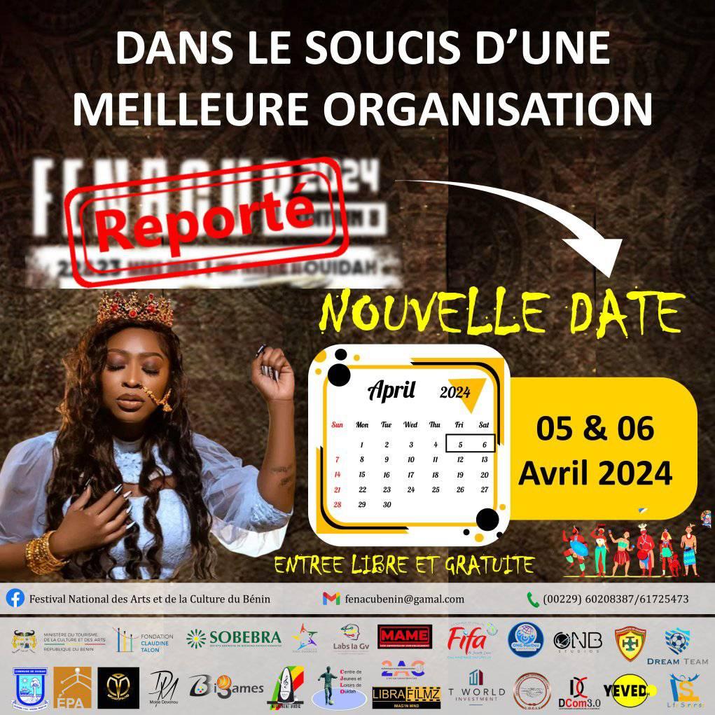 La huitième édition du Festival National des Arts et de la Culture du Bénin, initialement prévue les 22 et 23 mars est reportée au weekend du 05 au 06 Avril 2024. Thème retenu pour cette édition : l’art et la culture au cœur de la cohésion sociale au Bénin. La cérémonie de lancement est prévue pour se dérouler à la Maison de la Culture de Ouidah. À noter qu’un géant concert est programmé à l’esplanade Fort Français de Ouidah avec comme artiste invité Sessimè.