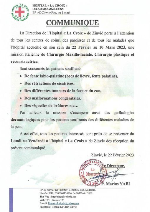L’hôpital « La Croix » de Zinvié organise une nouvelle mission chirurgicale du 22 février au 10 mars 2023. Il s’agit notamment d’une mission Italienne de chirurgie Maxillo-faciale, chirurgie plastique et reconstructrice. Sont concernés les personnes souffrants de fente labio-palatine (becs de lièvre, fente palatine), des rétractions de cicatrices, des différentes tumeurs de la face et du cou, des malformations congénitales, des séquelles de brulures etc. Il s’agira également de prendre en charge les pathologies dermatologiques, en rapport toutes les maladies de peau.